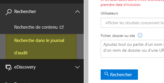 Lorsque vous y êtes, sur la gauche il faut dérouler la partie "Rechercher" et cliquez sur "Recherche dans le journal d'audit".