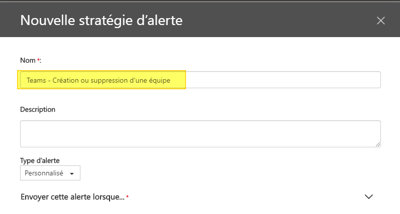 Cliquez sur le bouton pour créer une nouvelle stratégie d'alerte. Commencez par indiquer un nom, par exemple "Teams - Création ou suppression d'une équipe". Vous pouvez indiquer une description plus détaillée dans le champ adéquat.