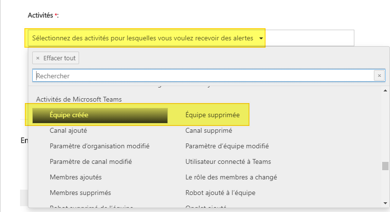Sous le champ "Envoyer cette alerte lorsque...", vous avez le champ "Activités" qui va permettre de rechercher les actions liées à Microsoft Teams. Je vous propose de cocher deux éléments : "Équipe créée" et "Équipe supprimée". Cela me semble bien par rapport à ce que nous cherchons à faire ?