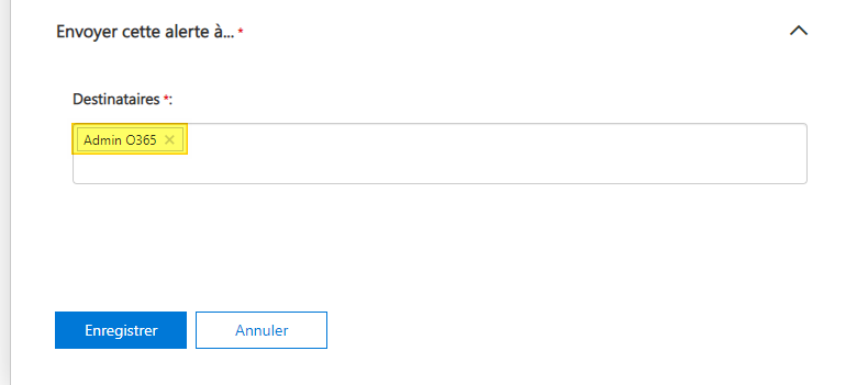 Ensuite, il est temps de choisir à qui envoyer les alertes e-mails. Vous pouvez choisir plusieurs destinataires. Indiquez les adresses e-mail souhaitées et cliquez sur "Enregistrer" pour valider. Bien sûr, il serait possible de créer une stratégie pour les créations d'équipe et une pour les suppressions d'équipes, si vous souhaitez définir des destinataires différents.