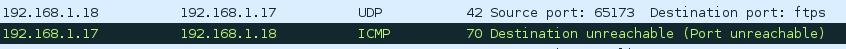 Nous voyons donc clairement après notre paquet UDP envoyé sur le port "990" qu'une réponse de l'hôte scanné nous est faite. Il s'agit donc du paquet ICMP comportant le message "Port unreachable". Nous voyons bien que le port est ici fermé.