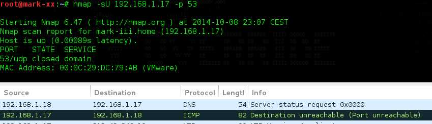 On voit donc que le paquet UDP envoyé pour sonder le port 53 comporte automatiquement une requête DNS sur le statut du serveur. Ainsi, un serveur standard mis sur un port autre que celui habituel (ou inversement) pourra fausser le résultat du scan.
