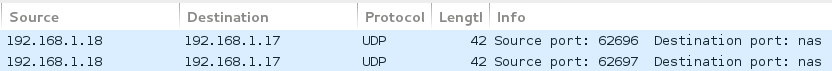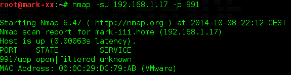 On voit donc que les deux paquets UDP envoyés sur le port donné "991" sont sans réponse de l'hôte distant. Nmap choisit d'envoyer deux paquets de par le risque qu'UDP représente. En effet, si un paquet est perdu, on pourrait ne pas avoir de réponse et croire que le port est ouvert alors qu'il n'a jamais atteint la cible, c'est pourquoi deux paquets sont envoyés.