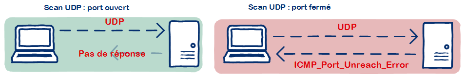 Du fait de la simplicité des échanges entre les machines utilisant le protocole de transport UDP, le scan des ports UDP n'est pas complexe à mettre en œuvre. En effet, il n'est possible de déterminer que deux états d'un port. Soit il est filtré ou ouvert, soit il est fermé. Dans le cas où le port est ouvert, aucun retour ne sera fait à notre machine de scan par le serveur ciblé. En effet, c'est le comportement normal des machines communiquant via UDP de ne pas renvoyer de paquet de bonne réception (ACK ou "acknowledgement"). À l'inverse, si aucune application n'est prête à recevoir notre paquet sur le port UDP visé, alors c'est un paquet ICMP qui nous est renvoyé avec le code d'erreur correspondant, soit le message "ICMP_Port_Unreach_Error". En ayant une différence entre la réaction d'un port ouvert et celle d'un port fermé, nous pouvons effectuer un scan de l'ensemble des ports UDP :