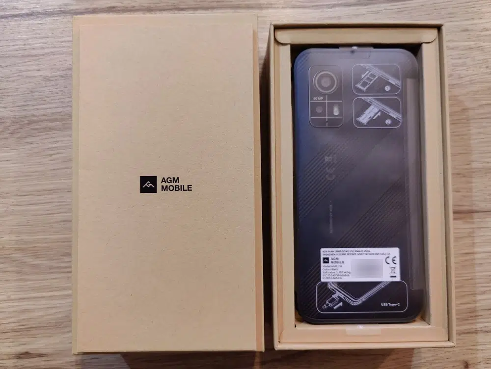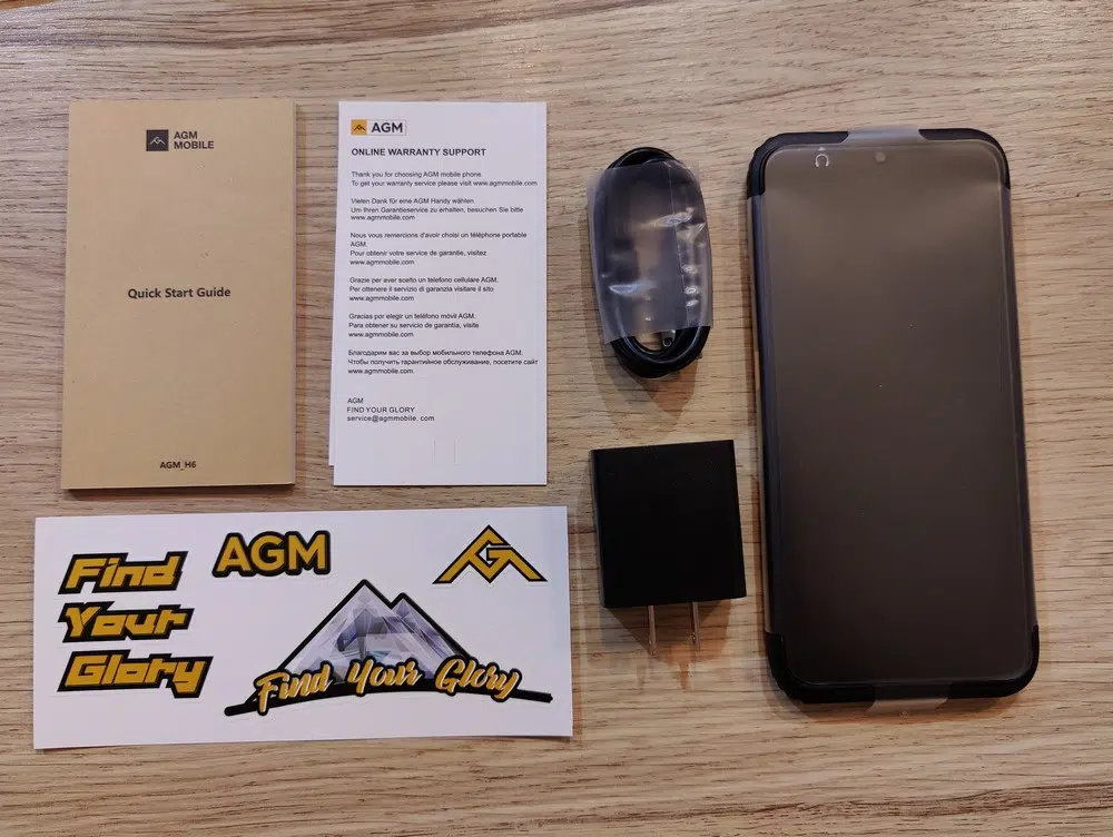 Le smartphone de chez AGM Mobile est livré dans une boite en carton très sobre au sein de laquelle le smartphone est bien emballé et suffisamment protégé. Il est accompagné par un guide de démarrage rapide, un câble USB-C, un chargeur (dont la prise ne correspond pas à ce que l'on utilise en France), ainsi qu'une planche de stickers à l'effigie de la marque ! Cela signifie qu'il faudra s'équiper de son propre chargeur (ou utiliser un adaptateur).