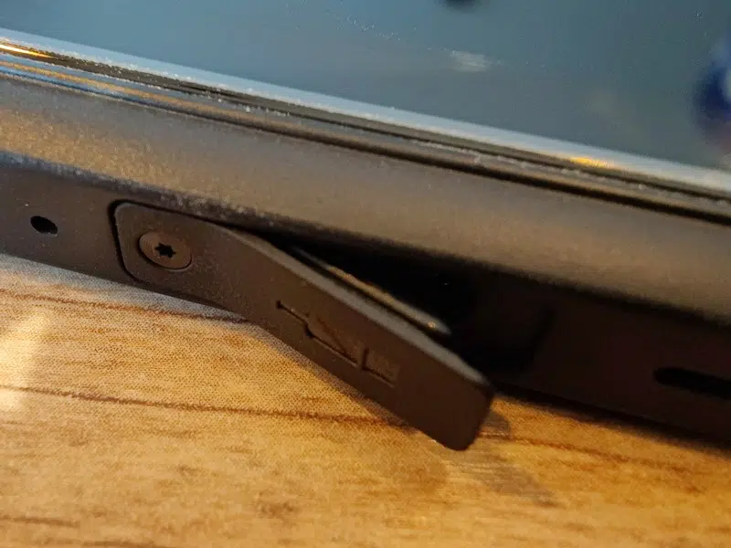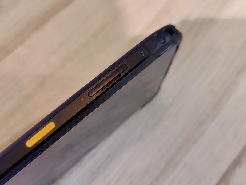 Pour cela, le port USB-C et la prise casque sont protégés par des caches afin d'assurer l'étanchéité. À ce sujet, le port USB-C est positionné sur la tranche inférieure du smartphone, tandis que la prise casque est positionnée sur la tranche supérieure. Les bords sont également plus épais et les 4 coins renforcés. Pour la protection de l'écran, sachez que le contour de l'écran est surélevé de 0,4 mm au-dessus de l'écran. Enfin, sachez que le coin supérieur gauche intègre une encoche permettant d'ajouter une dragonne !