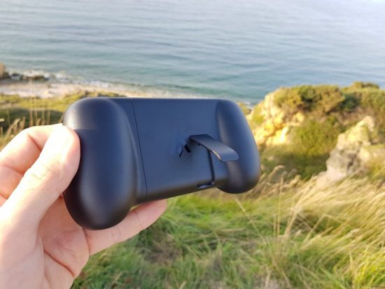 La batterie externe est conçue pour être utilisée de deux façons différentes : comme une manette de jeux, comme je l'évoquais en introduction, mais également en mode "stand". En effet, une béquille à l'arrière de la batterie va lui permettre de tenir sur place et ainsi maintenir le smartphone pendant que vous regardez une vidéo, par exemple. Tout en effectuant la recharge de l'appareil ?