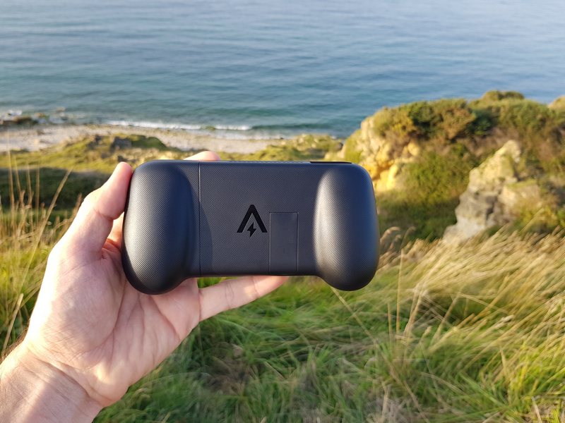 Sur le côté gauche, il y a le bouton "Power" qui sert à allumer et éteindre la batterie, bien qu'elle s'allume automatiquement lorsque l'on connecte un smartphone dessus. Sur le dessus, nous retrouvons les deux ports USB, et chaque extrémité prend la forme d'une poignée pour représenter un gamepad. La surface où se positionne le smartphone est totalement antidérapante.