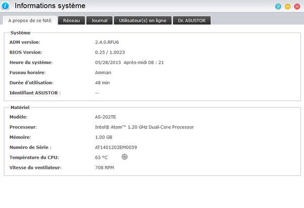 Il est intéressant de noter la volonté d'Asustor de maintenir ce modèle à l'ordre du jour en proposant les mises à jour de l'ADM encore à ce jour. De plus, il embarque 1 Go de RAM (certains modèles concurrents embarquent seulement 512 Mo) et un processeur Intel Atom ce qui intéressant, car ce dernier réagit bien lorsqu'il est sollicité.