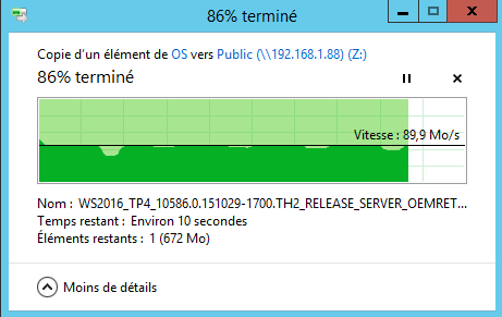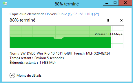 Lorsque le chiffrement est actif et que l'on effectue du transfert de fichiers via Windows, on ressent bien une baisse des performances, ce qui est tout à fait logique, mais les performances restent bonnes :