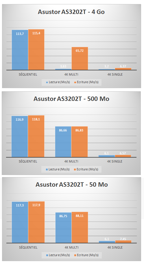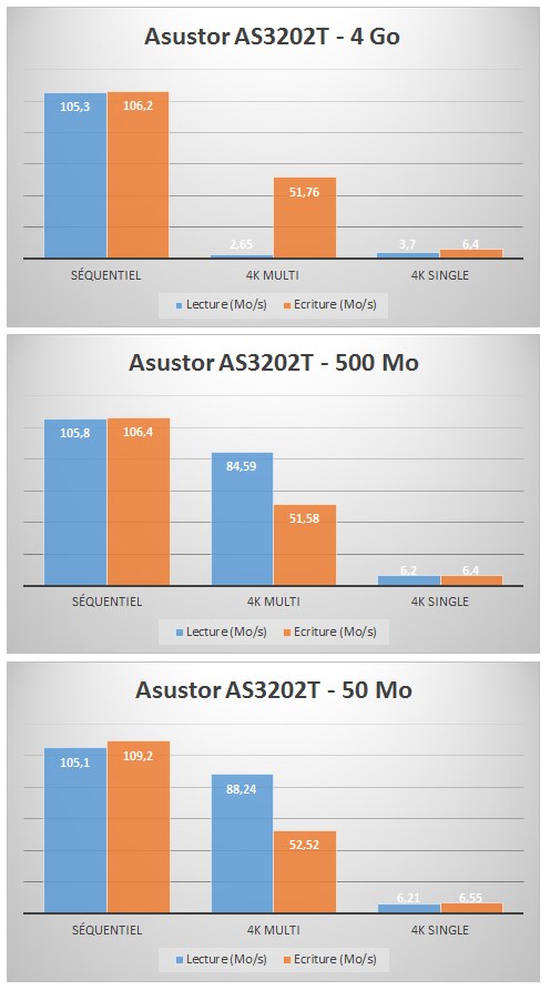 Et puis, après, les chiffres parlent d'eux-mêmes pour montrer que ce NAS Asustor AS3202T est capable d'offrir de très bons débits.