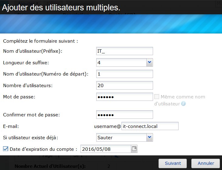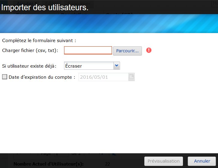 Ceci peut-être très pratique pour créer des comptes temporaires sachant qu'on peut gérer une date d'expiration. Sinon, on peut prendre un fichier source qu'il faudra formater correctement et l'importer via l'assistant pour générer une base d'utilisateurs, ce qui est très intéressant :