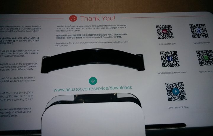 La boite en carton qui contient le NAS a l'avantage d'avoir une poignée, ce n'est pas grand chose mais il y a un côté pratique. Ensuite quand on ouvre la boite, on a un ensemble de QR codes vers différents services Asustor (boutique, support, site officiel, etc.), et puis quand même il ne faut pas oublier le "Thank You" car Asustor nous remercie de cet achat.