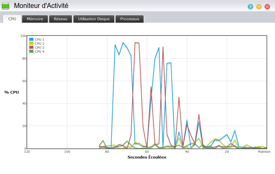 Le système d'exploitation ADM intègre un Moniteur d'activité complet par défaut qui permet de suivre en direct les performances de son NAS : Processeur, RAM, disque, réseau et processus seront détaillés. Par exemple, voici l'activité du processeur lors d'un benchmark Crystal Disk Mark avec le chiffrement actif :