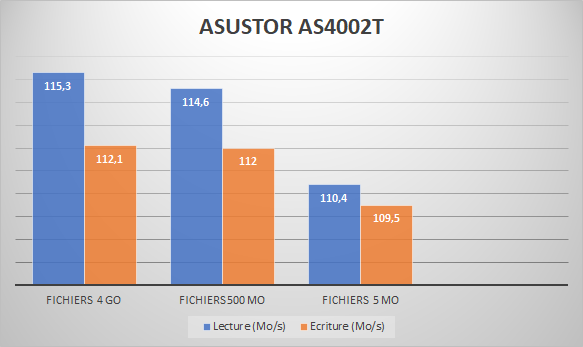 Après avoir réalisé quelques tests de performances avec l'ASUSTOR AS4002T, je peux affirmer quelles sont conformes avec ce que l'on a l'habitude de voir sur les NAS ASUSTOR : à savoir de bonnes performances. En témoigne les relevés effectués ci-dessous avec du transfert de fichiers SMB sur un lien 1 Gbit/s.