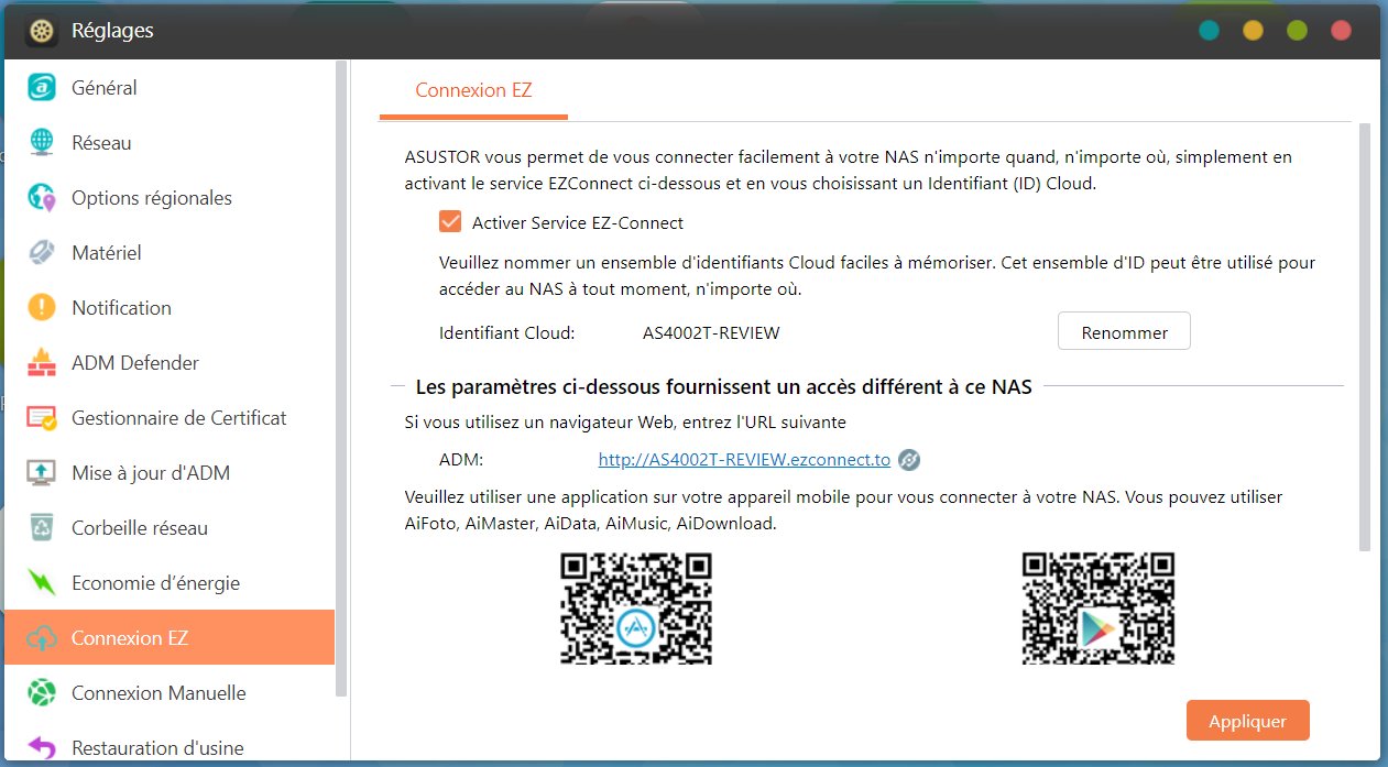 La configuration s'effectue très simplement depuis les réglages, il suffit de définir un identifiant Cloud et d'activer la fonctionnalité. La connexion à votre NAS est également simplifiée depuis les applications mobiles ASUSTOR qui sont très nombreuses : AiData, AiMaster, AiMusic, AiFoto, etc.