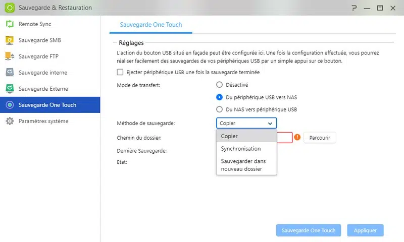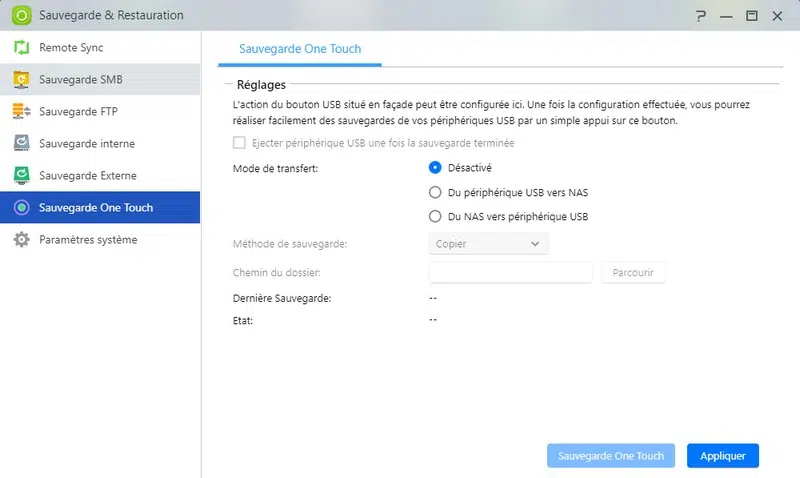 L'utilisateur peut s'appuyer sur cette fonction pour sauvegarder les données du NAS vers une autre destination, ou inversement, en utilisant Rsync ou les protocoles SMB et FTP. C'est aussi par son intermédiaire que la fonction de sauvegarde "One Touch", liée au bouton et au port USB présents sur la façade du NAS, peut être configurée. Pour rappel, l'objectif est de sauvegarder des données du NAS sur un disque USB, ou à l'inverse, sauvegarder un disque USB sur le NAS.