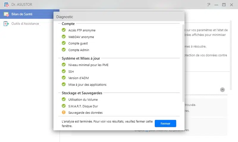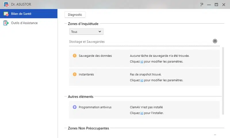 Comme à mon habitude, je vous recommande vivement d'utiliser l'application Dr. ASUSTOR ! Elle est là pour aider l'utilisateur à sécuriser son NAS. En quelques clics, vous pouvez obtenir un état de santé de votre NAS et obtenir des recommandations pour améliorer la sécurité du NAS dans son ensemble.