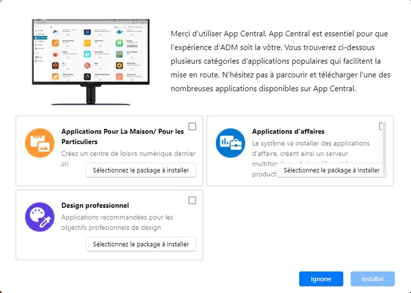 Le magasin d'applications du système ADM, baptisé App Central, donne accès à un ensemble d'applications qu'il est possible d'installer sur son NAS pour ajouter des fonctionnalités supplémentaires. Il y en a pour tous les goûts, aussi pour les particuliers que les professionnels. D'ailleurs, lors du premier lancement de cette application, un assistant nous invite à choisir des applications correspondantes à un usage spécifique.