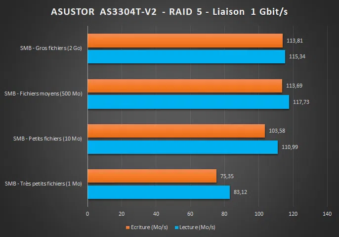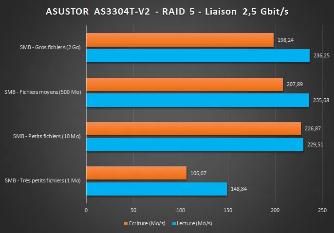 Remarque : sur son site, ASUSTOR annonce un débit de 283 MB/S en lecture et 280 MB/S sur un volume en RAID-5. Il s'agit de tests effectués par ASUSTOR en condition optimale.