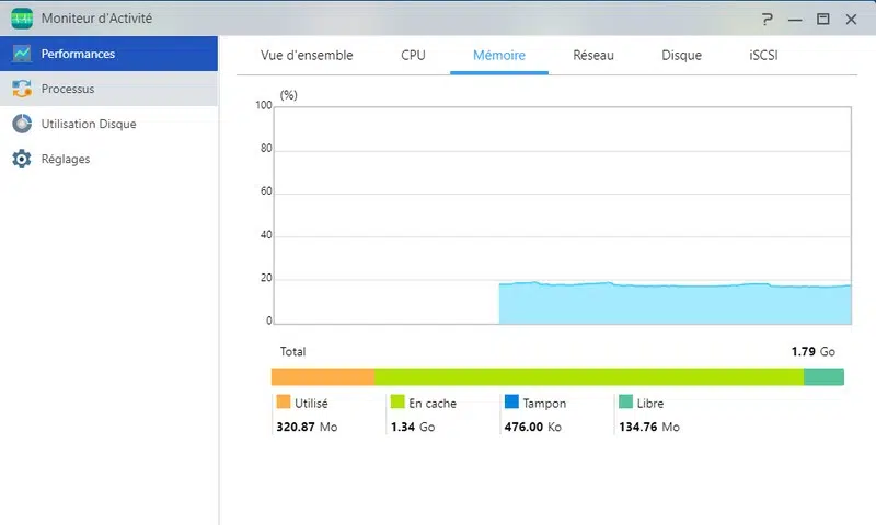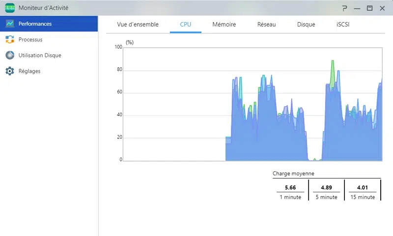 Lors du benchmark avec une connexion 1 Gbit/s, le CPU est sollicité à environ 40% pendant les phases d'écriture et à environ 30% pendant les phases de lecture. La consommation de la RAM est inférieure à 20%.