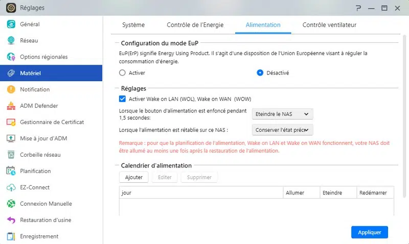 - Gestion de l’alimentation (mise en veille des disques durs, démarrer et éteindre le NAS selon un planning, vitesse du ventilateur, etc.)