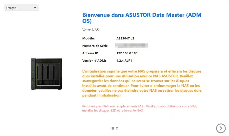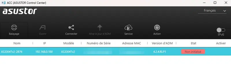 Pour cette fois-ci, l'application de bureau Asustor Control Center depuis Windows sera utilisée. Elle sert notamment à détecter la présence d'un NAS sur le réseau. Le nouveau NAS, avec le statut "Non initialisé" a bien été repéré. Il convient de cliquer sur ce bouton rouge pour accéder à l'interface du NAS.