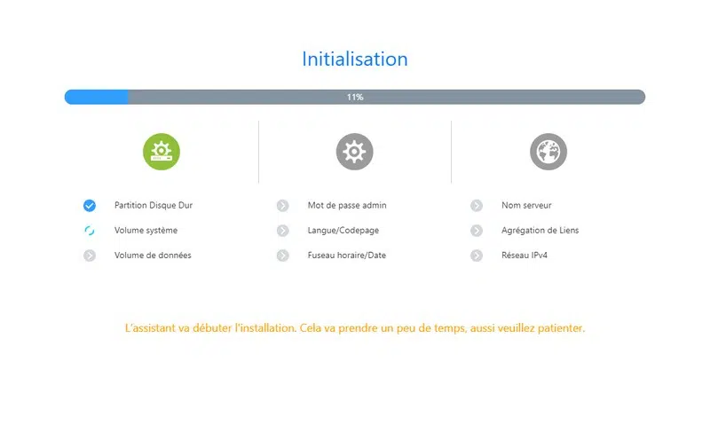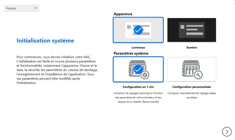 La mise en route s'effectue en quelques clics. Deux chemins sont cependant accessibles à l'utilisateur : une configuration rapide et guidée pour les débutants, et une configuration personnalisée pour les utilisateurs avertis. La méthode illustrée ci-dessous est celle baptisée "1-Clic", où la mise en route est simplifiée. L'ensemble des choix à effectuer pour initialiser le NAS sont regroupés sur une seule page.