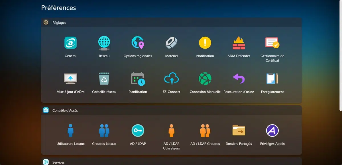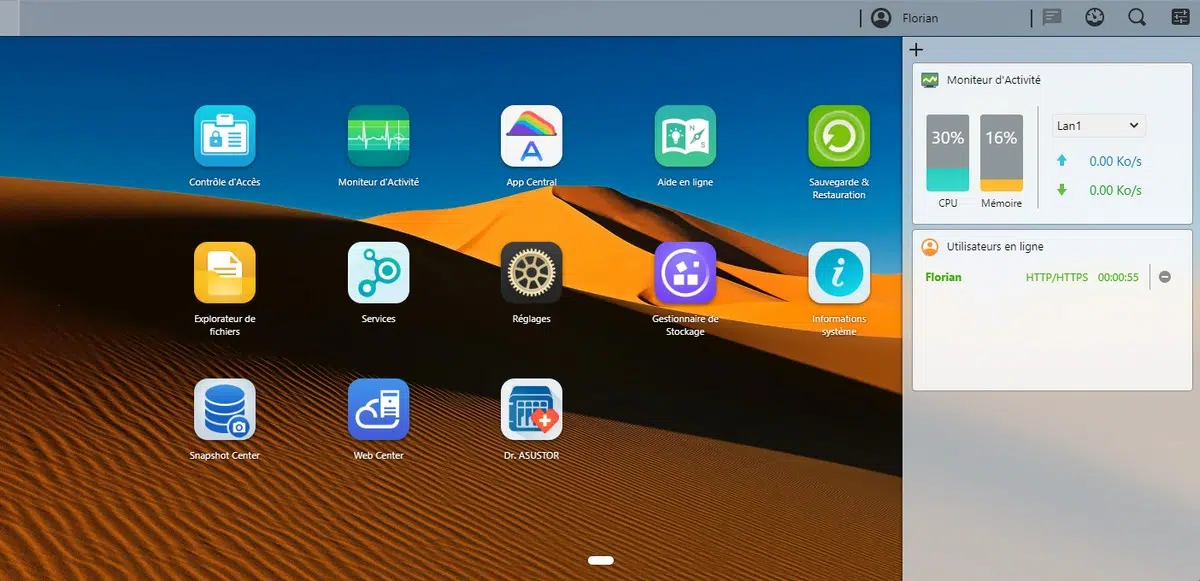 Ci-dessous, un aperçu global de l'interface d'ADM dans sa version 4.3.1-R6C1. C'est la version la plus récente à l'heure où ce test est rédigé (date de sortie : 12 juin 2024). ADM est un système fiable et abouti, qui bénéficie en plus d'une interface soignée et personnalisable. Sur le marché des NAS, le système ADM est une valeur sûre.