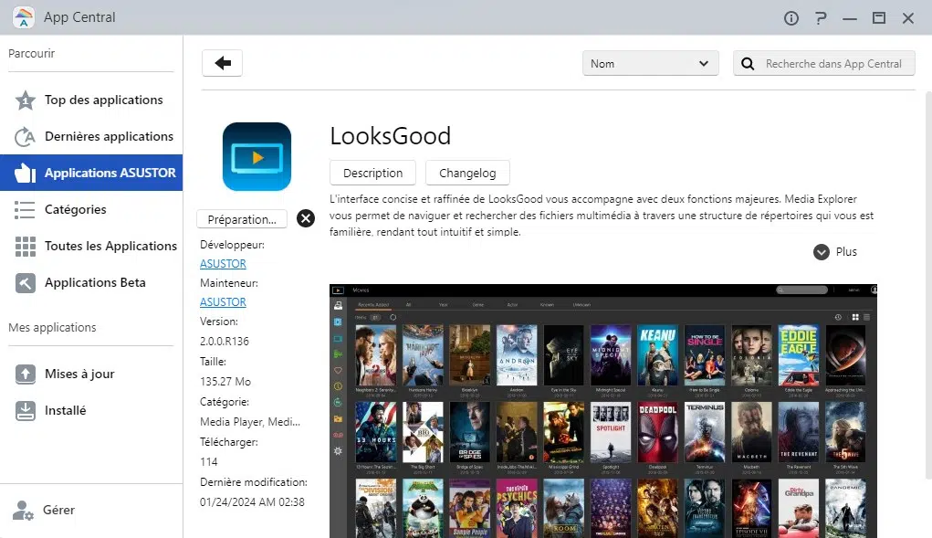 LooksGood permet à l'utilisateur de stocker et d'organiser ses vidéos personnelles, ainsi que des films et séries. Grâce à une synchronisation avec une base en ligne, l'application peut récupérer les métadonnées correspondantes à ces vidéos (titre, image de l'affiche, etc.). L'indexation du contenu s'effectue à partir des dossiers présents sur votre NAS : il vous suffit de charger vos vidéos dans ces répertoires et LooksGood s'occupe du reste. C'est en quelque sorte une alternative à Plex Media Server proposée par ASUSTOR.