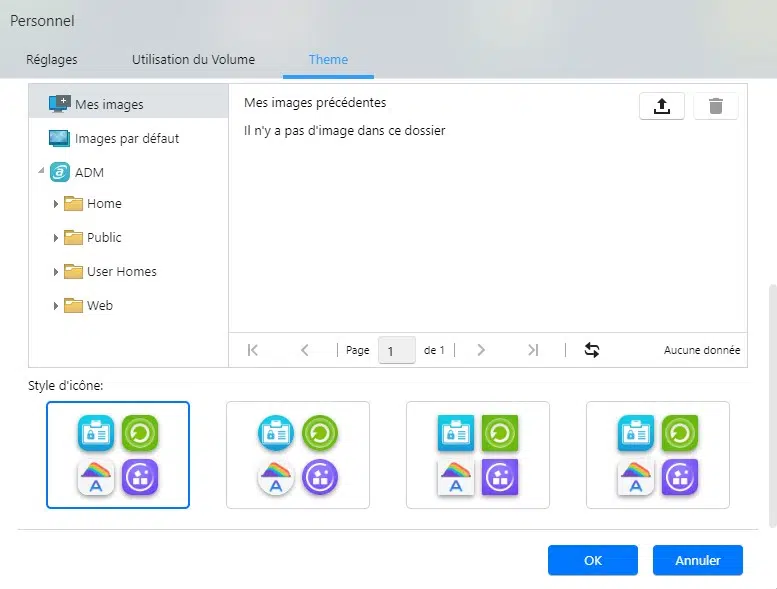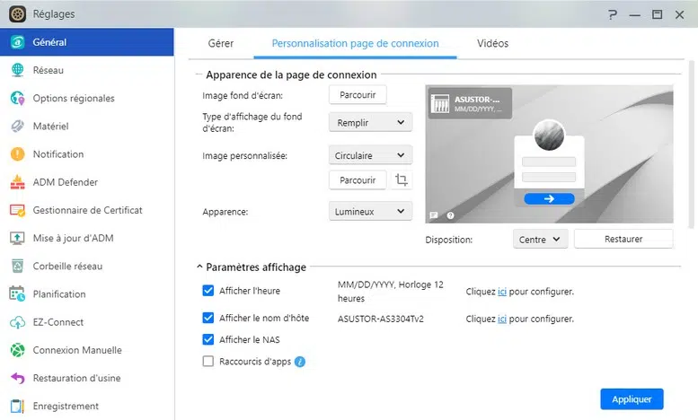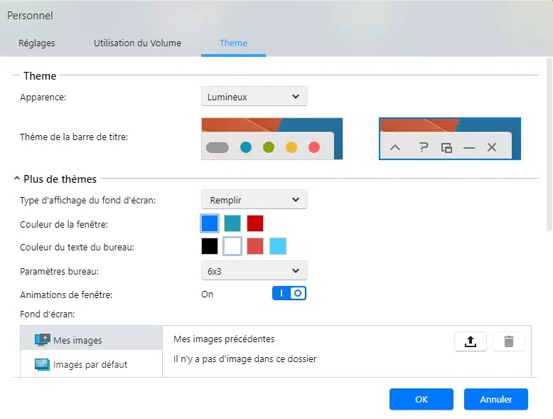 L'utilisateur peut personnaliser la page de connexion du NAS, mais aussi son espace personnel. Il peut choisir son propre fond d'écran, modifier la disposition des éléments sur le bureau, changer les couleurs des boutons ou encore modifier le type d'icônes.
