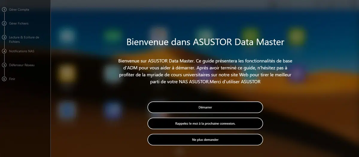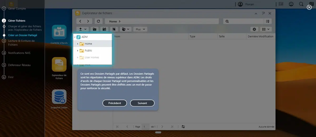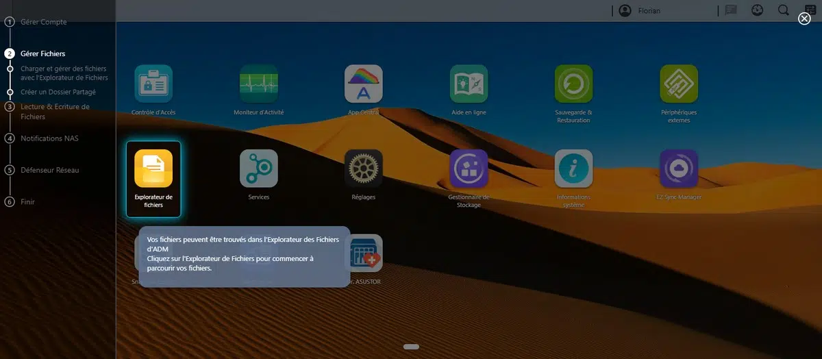 Une fois cette étape passée, un tutoriel interactif apparaît à l'écran ! Il est là pour vous accompagner et vous aider à prendre en main le système ADM. Les débutants apprécieront, car ce tutoriel explique comment créer un utilisateur, un dossier partagé, etc.