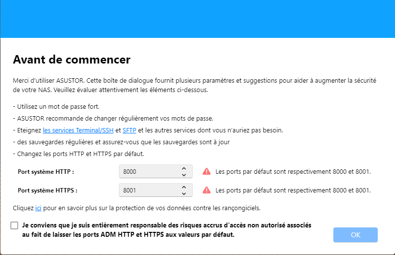 Lors de la première connexion au NAS, l'utilisateur est invité à lire quelques conseils liés à la sécurité de l'appareil. A juste titre, ASUSTOR vous recommande de ne pas utiliser les numéros de ports par défaut pour l'accès au NAS.