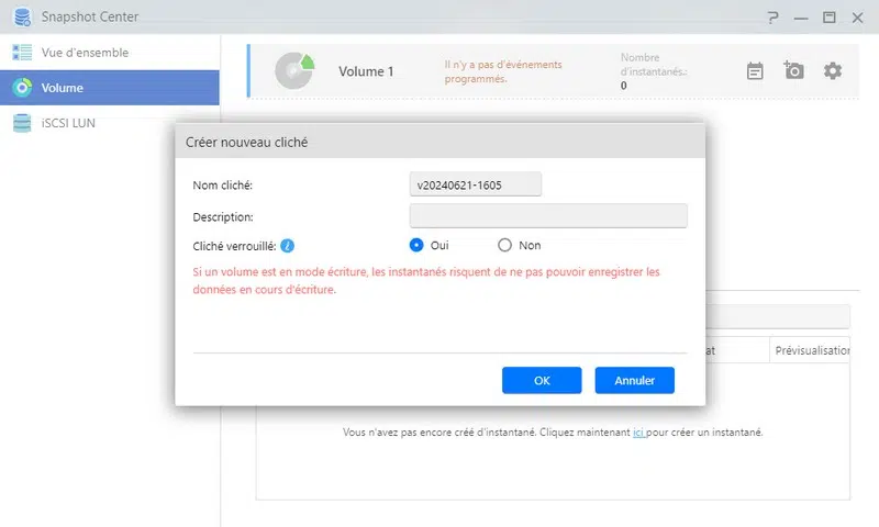 Le fait d'utiliser le système de fichiers Btrfs permet de créer des snapshots par l'intermédiaire du "Snapshot Center". Chaque snapshot correspond à une "photo" à l'instant t de vos données. Ainsi, en cas de suppression accidentelle ou d'acte malveillante, il sera possible de récupérer vos données par cet intermédiaire. De plus, ASUSTOR a intégré la possibilité de créer des clichés verrouillés, c'est-à-dire que l'utilisateur ne peut pas les supprimer de lui-même : c'est une fonction de sécurité importante. Ceci me semble faire référence à la création de snapshots immuables.