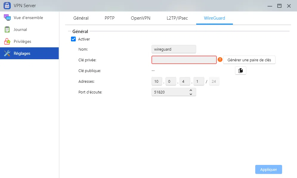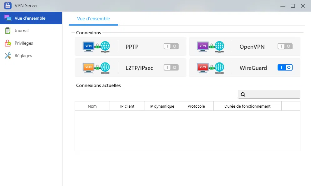 La version la plus récente du système, à savoir ADM 4.3, a ajouté la prise en charge du protocole WireGuard à VPN Server. Un ajout qui fera sans doute plaisir à certains d'entre vous ! WireGuard est nettement plus performant qu'OpenVPN.