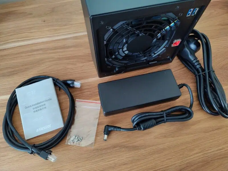 Le panel d'accessoires habituel chez ASUSTOR accompagne le NAS, à savoir un guide d'installation rapide, une alimentation externe et le câble adéquat, ainsi qu'un câble Ethernet RJ45 et des vis.