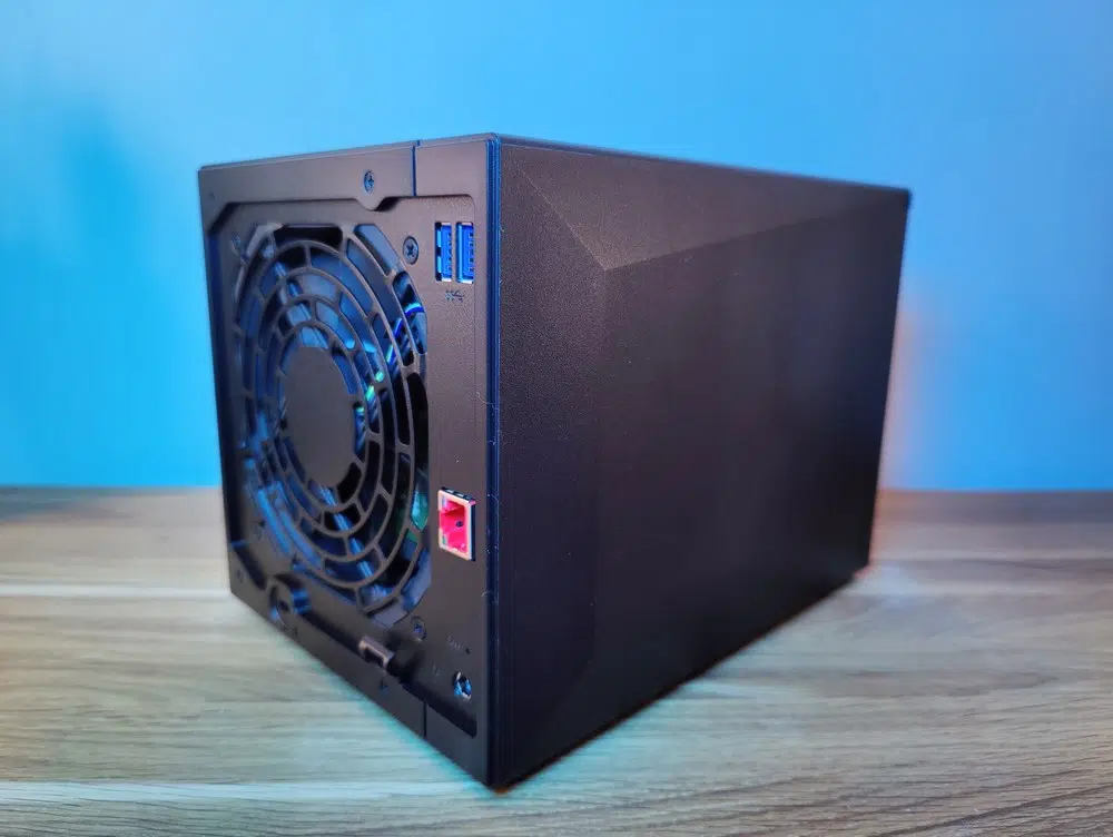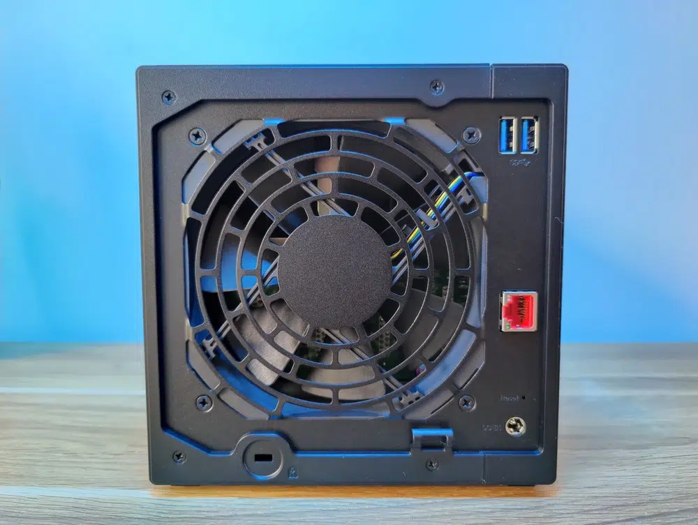 À l'arrière, l'utilisateur peut accéder à deux ports USB et à l'interface réseau RJ45 en 2.5 GbE. Difficile de manquer l'imposant ventilateur de 120 mm. Nous pouvons noter l'absence d'un port HDMI, pourtant bien présent sur d'autres modèles. C'est dommage, car le port HDMI permet de bénéficier de l'application ASUSTOR Portal appréciable pour les usages personnels.