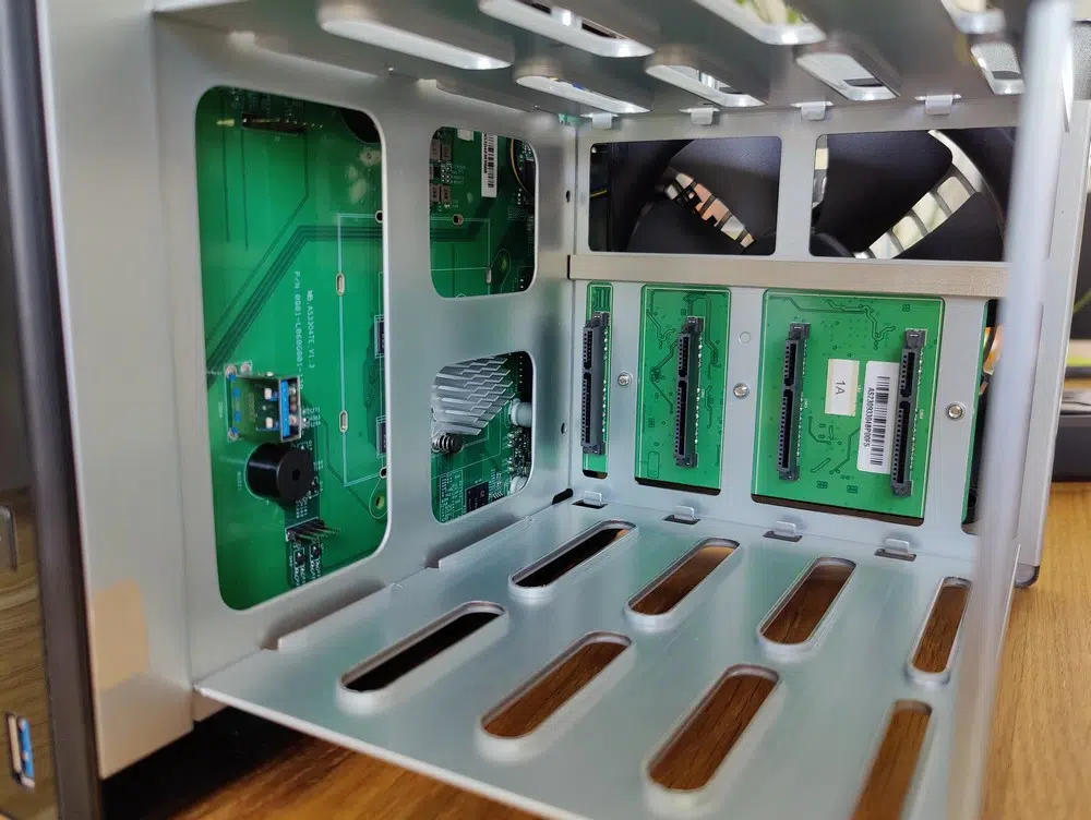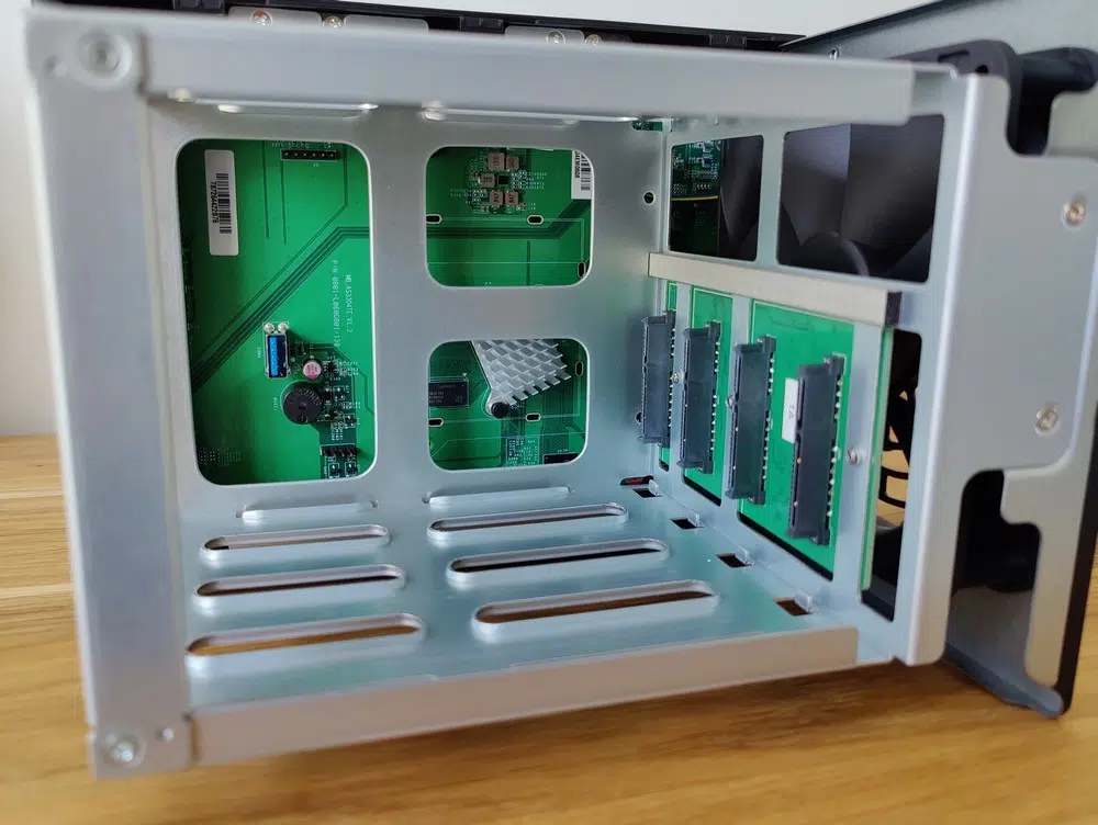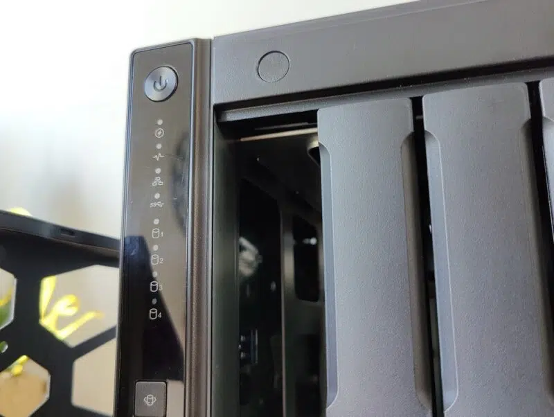 Le fait de retirer la façade amovible et maintenue par 4 aimants donne accès aux baies de disques du NAS.