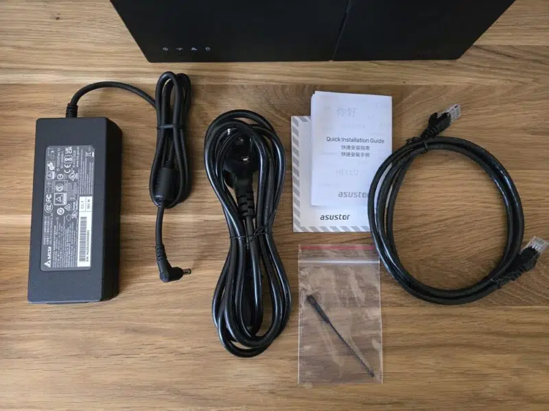 Comme à son habitude, ASUSTOR fournit un panel d’accessoires complet avec son NAS : un guide d’installation rapide, une alimentation externe avec son câble, ainsi qu’un câble Ethernet RJ45. Malgré tout, nous n'avons pas de dissipateurs thermiques pour les disques SSD NVMe. L’absence de vis peut surprendre, mais c’est tout à fait normal : ASUSTOR a conçu un système d’installation des disques NVMe sans vis ni outils.