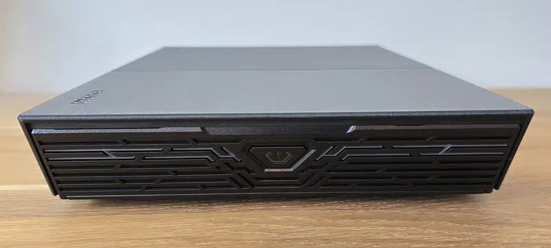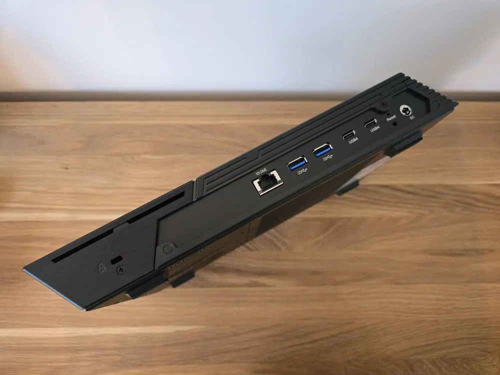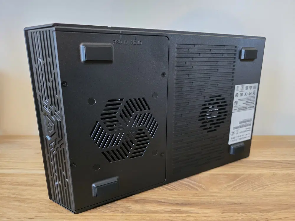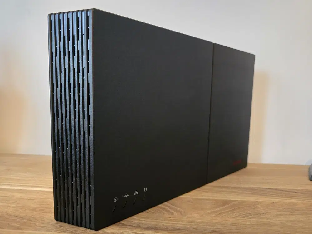 Quand j'ai découvert ce NAS et son boitier pour la première fois, il m'a fait penser à une console de jeux, et plus particulièrement à la PS4 Slim. Mais, il s'agit bien d'un NAS ! Entièrement noir, il adopte une forme plate et angulaire qui tranche avec l'apparence traditionnelle des NAS. Il n'aura aucun mal à s'intégrer sur un meuble ou dans un setup gaming. Ce boitier est une vraie réussite et son originalité est à souligner.