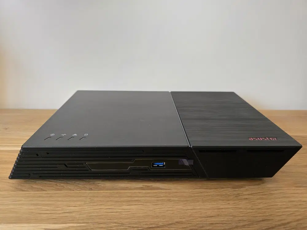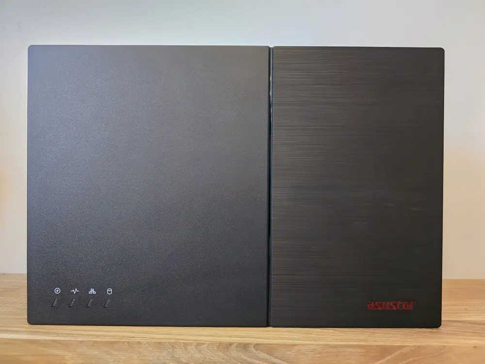 Sur le dessus du boitier (quand il est à plat), il y a une partie noire mat, avec 4 indicateurs LED, et une partie noire avec un effet brossé accompagné par le logo ASUSTOR. Sur la façade, un port USB 3.2 Gen 2 Type-A a été positionné. Tandis que le bouton d'alimentation est positionné sur le côté droit. À l'arrière du NAS, il y a tous les autres ports, que ce soit le port Ethernet ou les autres ports USB. Une encoche Kensington est également intégrée au boitier, ce qui vous permet de le protéger contre le vol. La coque du boitier est en plastique, tandis que le châssis est en métal.