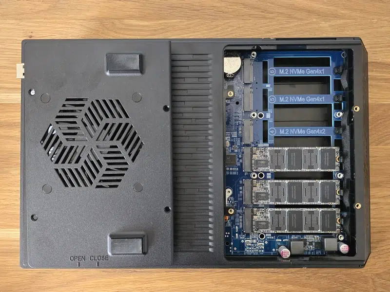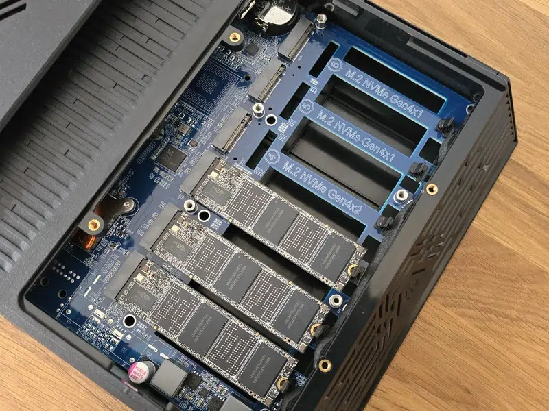 Pour accéder aux emplacements et installer les SSD NVMe, il faut retourner le NAS et retirer quatre vis. Une fois le capot enlevé, on découvre directement les six emplacements numérotés, facilitant l’organisation des disques.