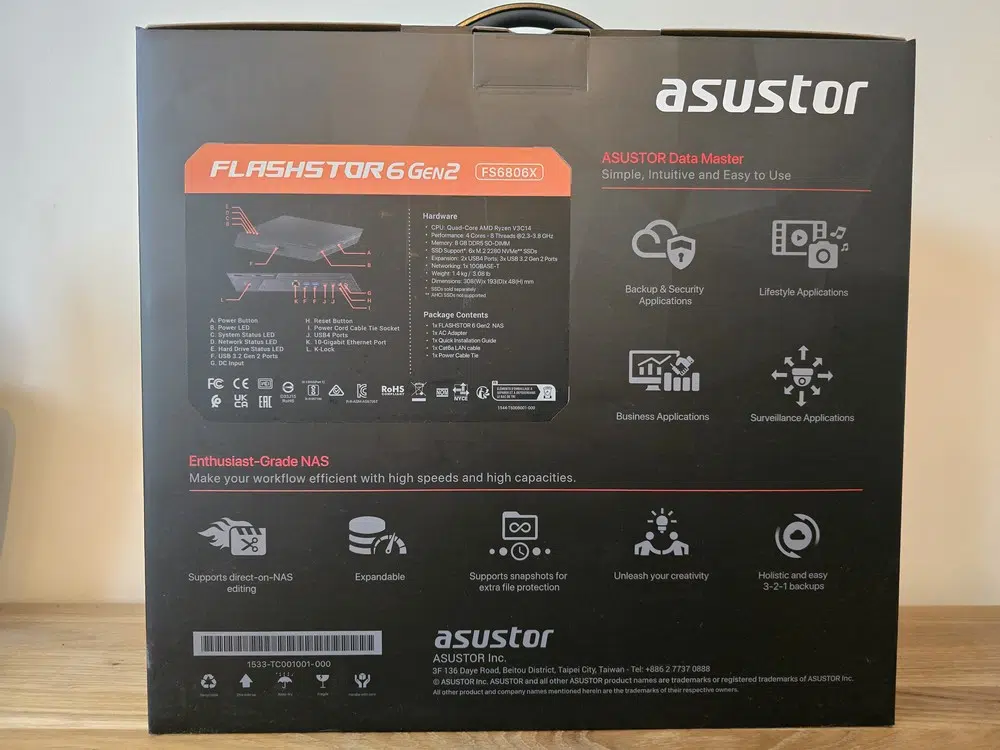 ASUSTOR nous a habitués à un packaging soigné, et ce nouveau modèle ne fait pas exception. La boîte met en valeur les principales caractéristiques du NAS tout en offrant un aperçu précis de son design. Au dos, on retrouve un récapitulatif de la connectique ainsi que la fiche technique du produit.