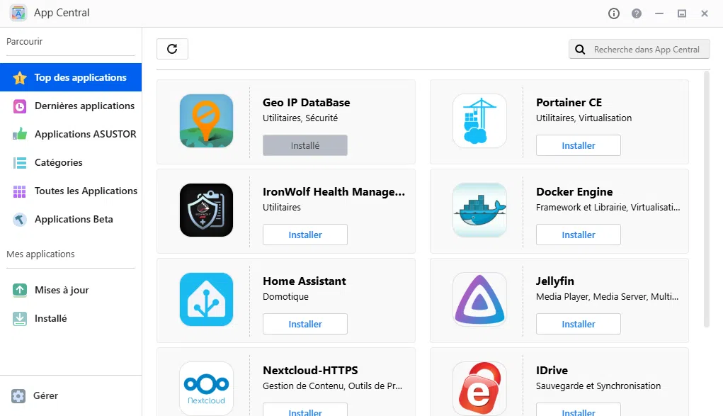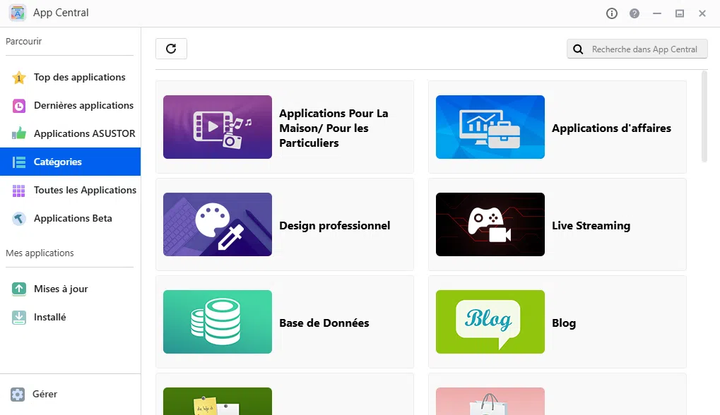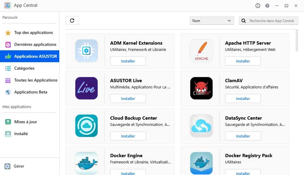 Le magasin d'applications du système ADM, appelé App Central, offre un large éventail d'applications que vous pouvez installer sur votre NAS pour ajouter des fonctionnalités supplémentaires. App Central propose plusieurs dizaines de paquets prêts à l'emploi, certains développés par ASUSTOR, d'autres par la communauté d'utilisateurs. Il s'agit de paquets installables en quelques clics et conçus pour les NAS ASSUTOR.