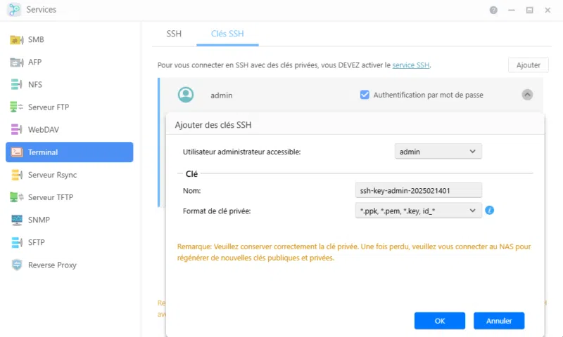 Le service SSH, utile pour se connecter à distance au NAS en ligne de commande, prend désormais en charge l'authentification par clé SSH. Là encore, c'est un plus pour la sécurité.