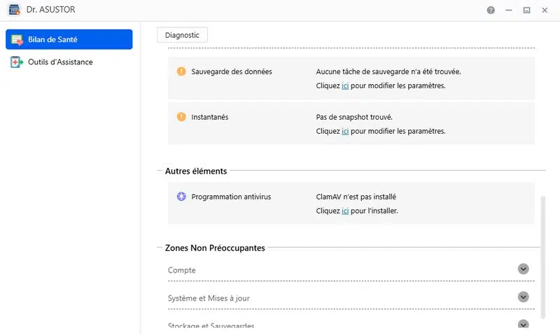 Comme d'habitude, je vous recommande fortement d'utiliser l'application Dr. ASUSTOR ! Elle est conçue pour aider les utilisateurs à sécuriser leur NAS. En quelques clics, vous pouvez obtenir un diagnostic de l'état de santé de votre NAS et recevoir des recommandations pour améliorer la sécurité globale de votre système. Dr. ASUSTOR vous sert de guide, si vous ne savez pas par où commencer pour sécuriser votre NAS.
