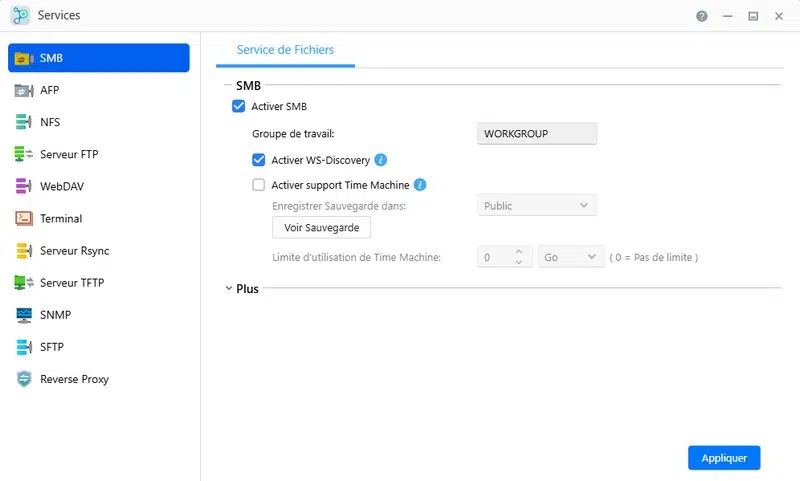 - Prise en charge de nombreux protocoles : NFS, FTP, WebDAV, SMB, SFP, AFP (MacOS), SNMP, TFTP, SFTP, etc.