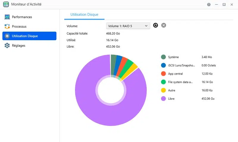 - Gestion du stockage (espace utilisé, volumes, cible iSCSI, clichés instantanés, etc.)