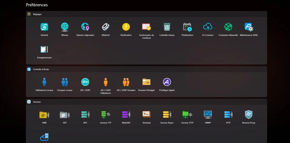 - Création de comptes utilisateurs ou de groupes, avec possibilité d'associer le NAS à un serveur Active Directory / LDAP