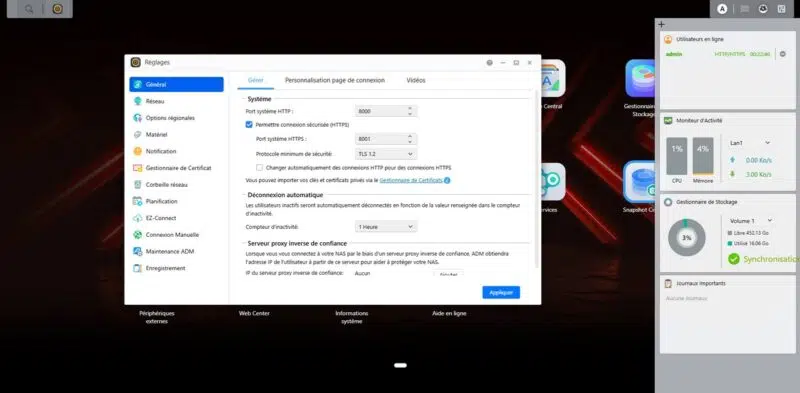 Il est tout à fait possible d'ouvrir plusieurs fenêtres en même temps. Elles seront alors visibles dans la barre des tâches de l'interface, un peu comme sur Windows ou certaines distributions Linux. L'interface est fluide et agréable à utiliser. Vous avez aussi la possibilité d'afficher un panneau latéral avec quelques widgets, afin d'avoir une vue d'ensemble sur l'état de votre NAS : qui est connecté, quelle est la charge CPU, combien est-ce qu'il reste d'espace disque disponible, etc.